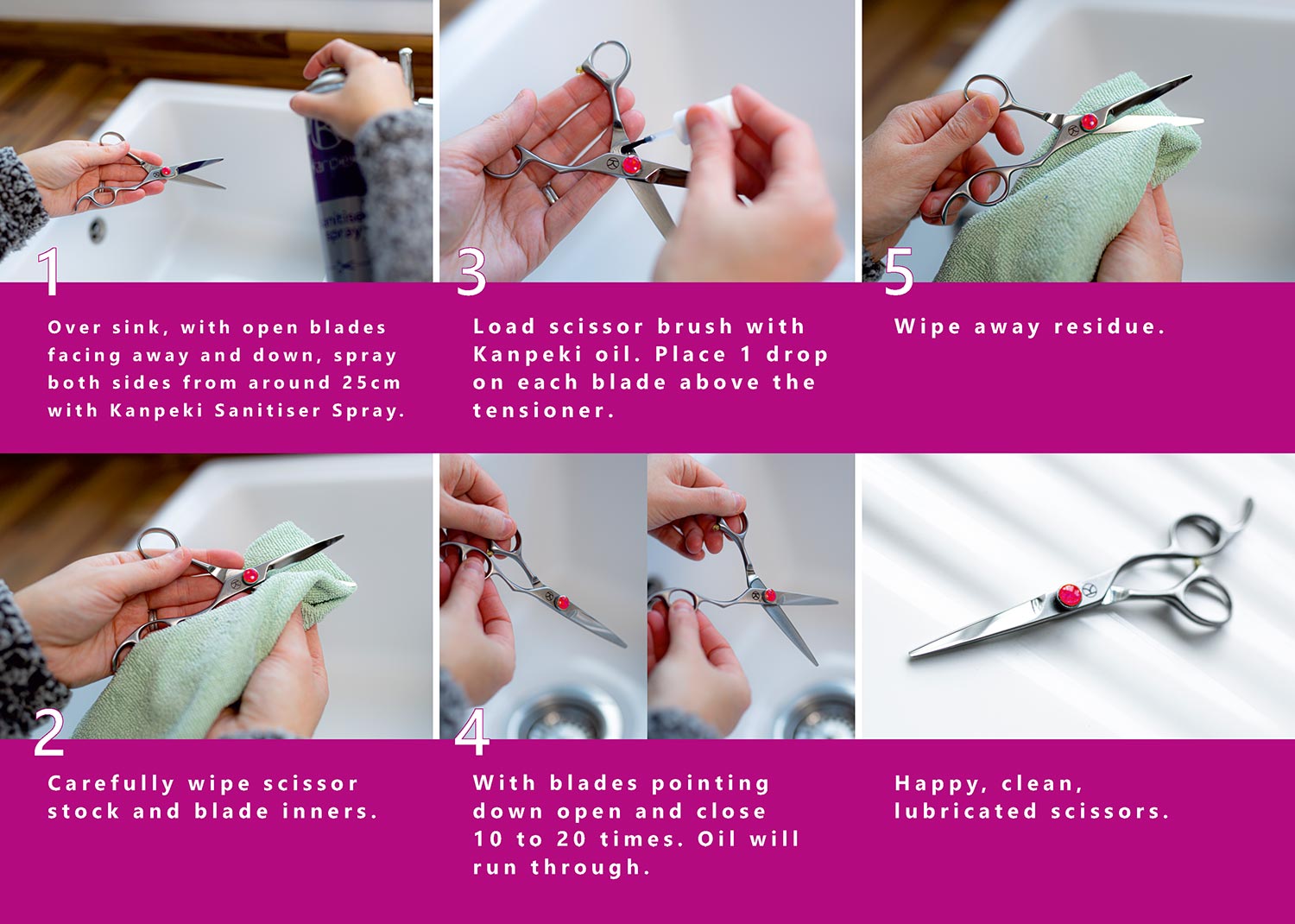 - Load scissor brush with Kanpeki oil and place 1 drop on each blade above the tensioner.