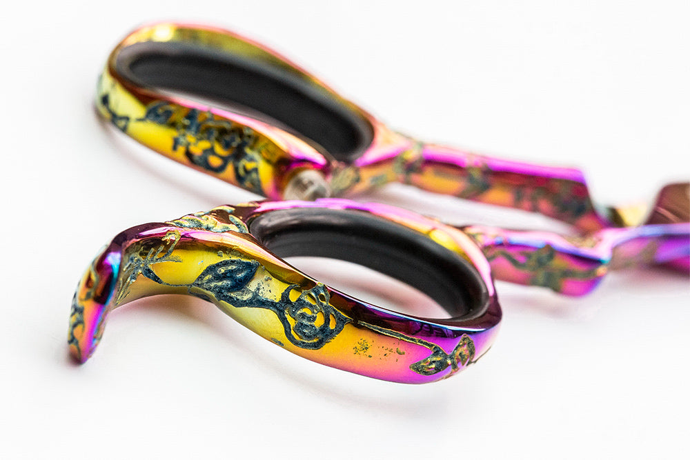 Kanpeki’s high-fashion Murasaki hairdressing scissors, moulded in Japanese stainless steel with a purple and gold titanium coating are guaranteed to wow your clients and colleagues. Complete with razor-sharp machined convex blades for smooth, high-speed cutting and styling.